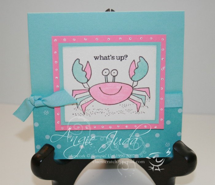 Here’s the details on my card……Stamps: Crab & Company (speaking of Crab, holy cow, have you ever had the Crab Cakes at J Gilberts? We had them last night and they were heavenly!!!) Sentiment by A Muse Ink: Timber Brown Stazon, Regal Rose & Cool Caribbean Cardstock: Cool Caribbean, Regal Rose, Shimmery White & Petals & Paisley Designer Paper (Spring Mini Catalog) Tools & Accessories: Aquapainter, White Gel Pen, Paper piercer, Michaels Ribbon and Stampin’ Dimensionals