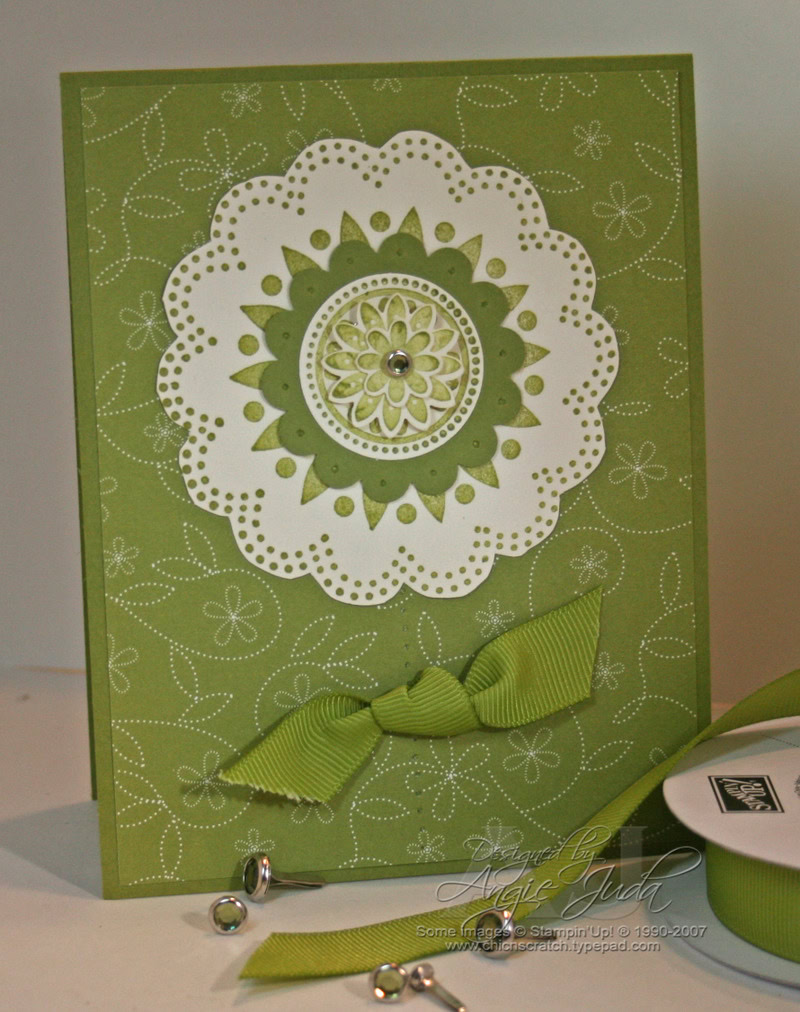 Other:  Chic Stand, Rhinestone Brads, Paper Piercer, Matt Pack, Scallop Punch, 5/8 Olive Grosgrain, Glue Dots, Stampin’ Dimensionals & Boho Blossoms Punch