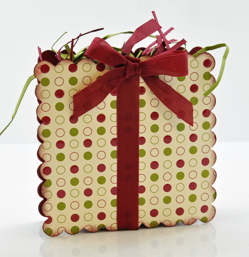 Here's the supply list for Colleen's box: Scallop Square Die #115950, Jolly Holiday Designer Paper #117159, Cherry Cobbler Seam Binding #120992. And she added Crystal Effects #101055 to all the Cherry Cobbler dots…..it's sooo cute!!