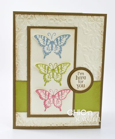 - Tools/Accessories: Vintage Wallpaper Embossing Folder #120175, 1″ Circle Punch #119868, 1-1/4 Circle Punch #119861, Sponges #101610, Champagne Mist Shimmer Paint #116806, Elegant Butterfly Punch #127526, Mini Glue Dots #103683, Dimensionals #104430, Big Shot Die Cut Machine #113439