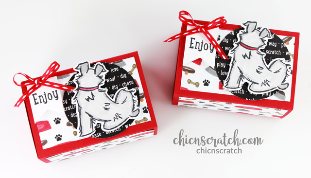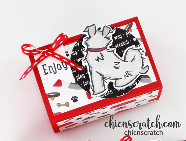The box can be made with one sheet of Real Red Cardstock and it’s super simple to make! I used the Playful Pets Designer Series Paper to decorate the box with the coordinating Playful Pets Trim Combo Pack.